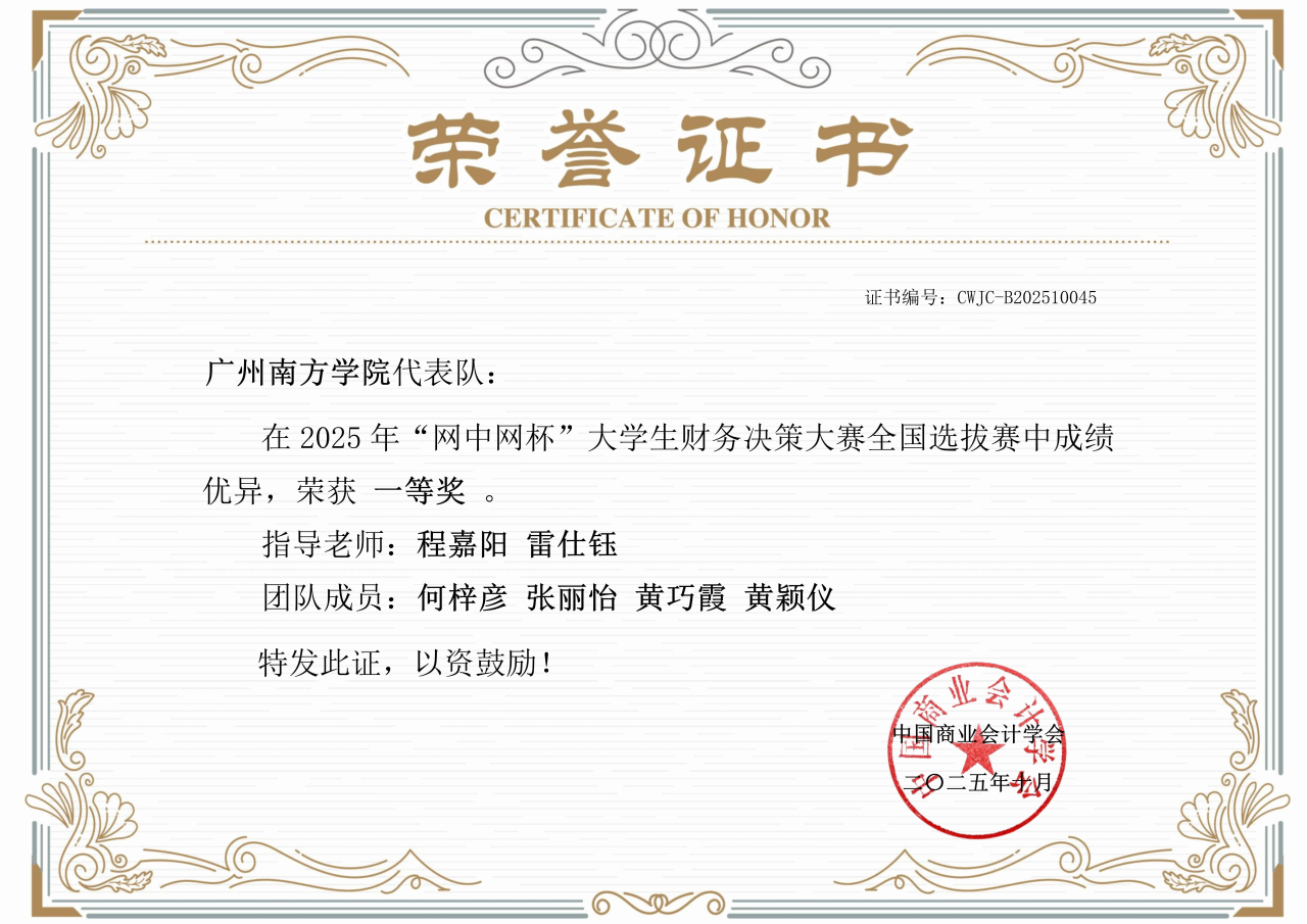 2025年10月12日,“网中网杯”大学生财务决策大赛全国选拔赛线上赛事圆满落幕。太阳集团城官网从校内选拔赛中角逐出的两支精英队伍——“小白进阶版”与“网贷大队”,代表学校征战全国选拔赛,最终凭借过硬的专业实力与高效的团队协作,双双斩获全国选拔赛广东省一等奖(广东省共有32支队伍、全国共有493支队伍参加全国选拔赛)。