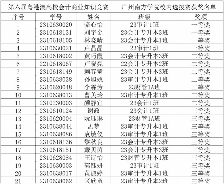 本次比赛构建了“以赛促教,以赛促学”的教学改革模式,充分展现了我集团学子扎实的专业素养和较强的分析能力;学院对各位获奖同学表示热烈祝贺,希望以上同学戒骄戒躁,争取更大进步。也希望学院代表队能够在粤港澳高校会计商业知识竞赛中取得好成绩,力争为个人成长、为学院发展再创佳绩、再添光彩!校内选拔赛获奖情况公示(排名不分先后):