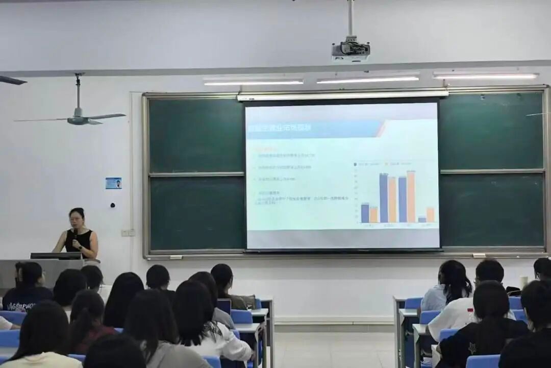 10月15日14:00,资深职业生涯规划师陈永素老师以《应届生职业规划》为题,为系列活动拉开序幕。她围绕“自我认知、应届生就业现状、求职资源搜索”三大核心模块展开讲解,引导学生科学分析自身性格特质与职业倾向,结合近几年企业选拔等最新趋势,重点传授“岗位信息精准筛选法”“行业调研四步策略”等就业技巧,帮助学生将职业目标拆解为“可量化、可操作”的阶段性计划。活动中,陈老师特别强调“职业目标的清晰度与专业学习的聚焦度密不可分”,鼓励学生夯实专业知识,积累对应能力。