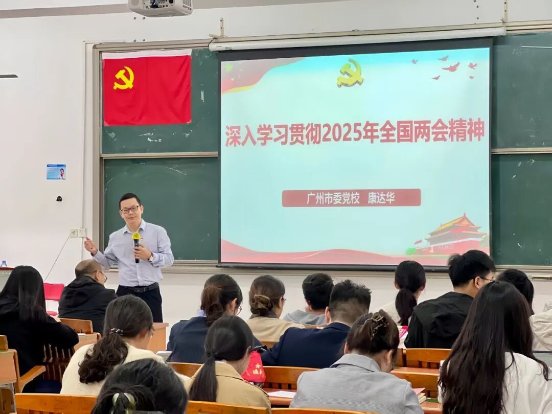 首先,为深入学习贯彻2025年全国“两会”精神,本次教工党支部党员专题培训课特邀中共广州市委党校经济学康达华教授进行授课。康教授立足中央经济工作会议、党的二十大、党的二十届四中全会及“十五五”规划等重要会议和文件精神,系统阐释了全国“两会”在党和国家事业发展全局中的重大意义。同时,他紧密结合当前形势与任务,对全国“两会”精神的核心要义作了深入解读。